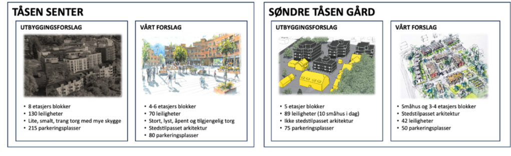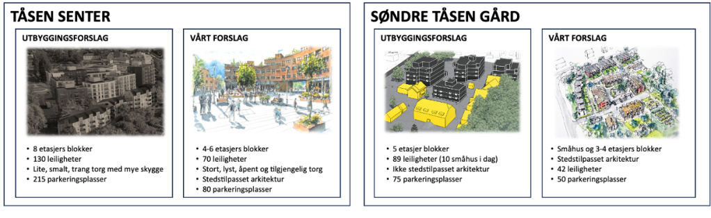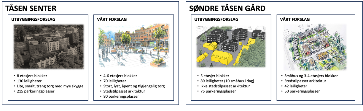Vår mening er at begge planforslagene må avvisesog det må utarbeides et tredje alternativ som tilfører Tåsen som sted verdier som er til felleskapets beste. Sammen med Tåsenaksjonen har jo skissert et slikt tredje alternativ.