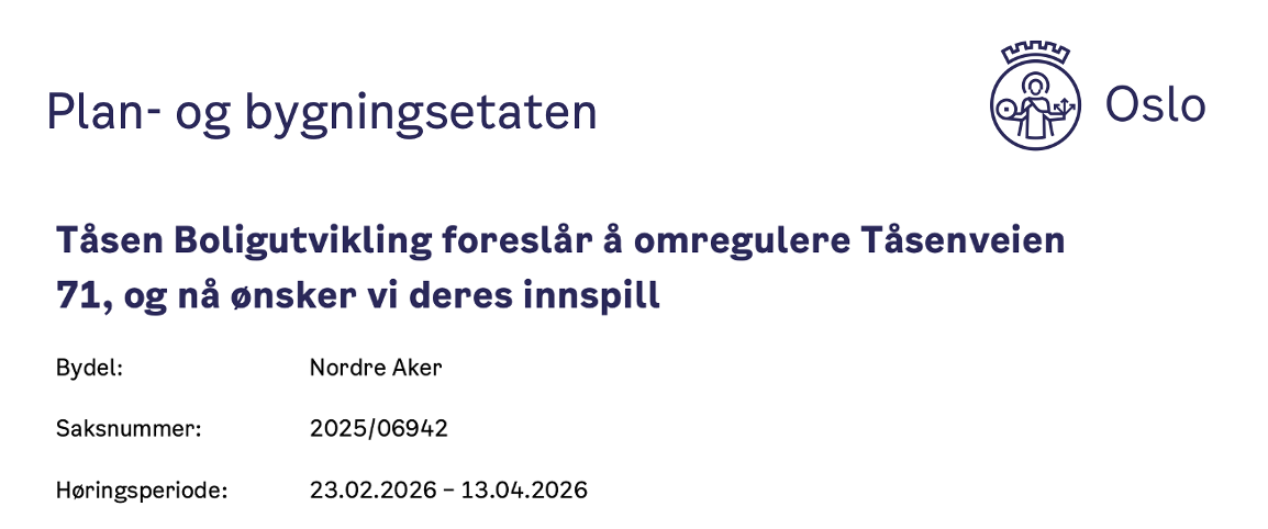 Planforslaget for Søndre Tåsen Gård er nå lagt ut høring – til tross for sterke faglige innvendinger og betydelig motstand i nabolaget. Dette er tidspunktet hvor alle naboer har mulighet til å påvirke utfallet. Vi oppfordrer derfor alle til å sende inn høringsinnspill til Plan- og bygningsetaten (PBE).