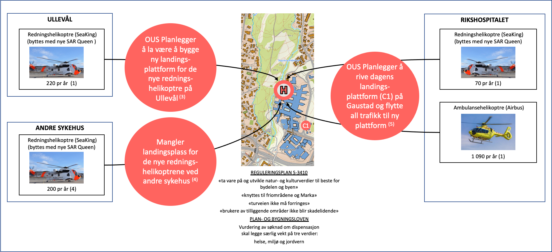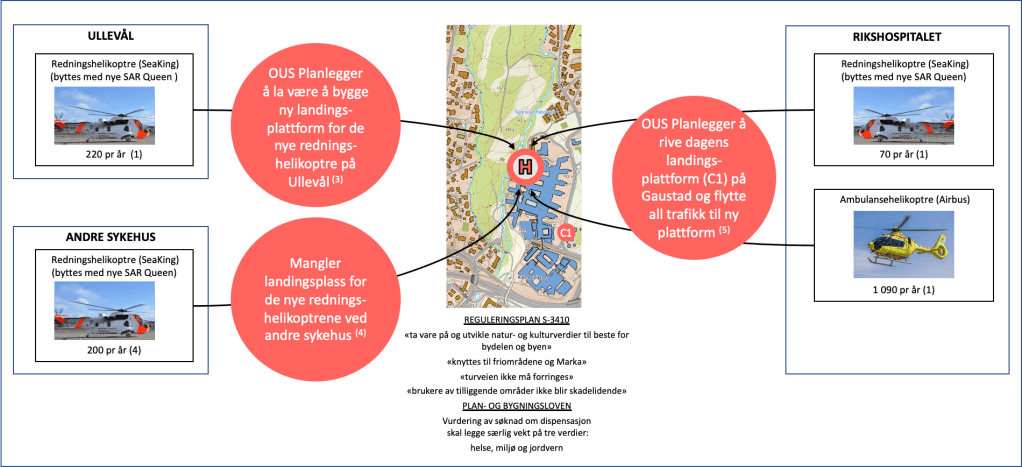 Dagens bygninger på Rikshospitalet er ikke konstruert for bygges opp til 60 meter høyde og derfor må 10% av bygningsmassen rives. Noe av det første som ønskes revet, er dagens akuttmottak i sør. Dette planlegges flyttet midlertidig til den nordvestlige delen av sykehusområdet. Dagens Helipader i sør må også rives og derfor ønsker HSØ/OUS nå å lage en midlertidig Helikopterlandingsplass nordøst, rett ved Sognsvannsbekken. Her planlegges det også at de nye, store redningshelikoptrene lande. Dette skaper store problemer og skadevirkninger for beboere og dem som ferdes i området. Samme problemer finnes også andre steder i landet.